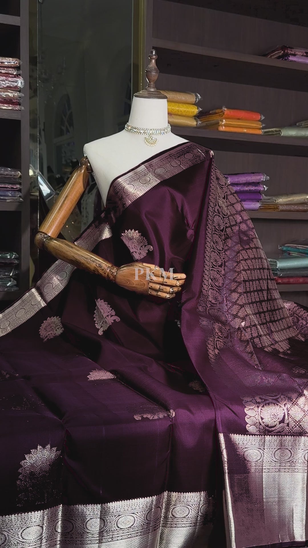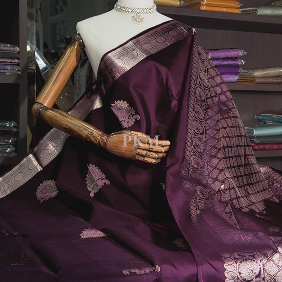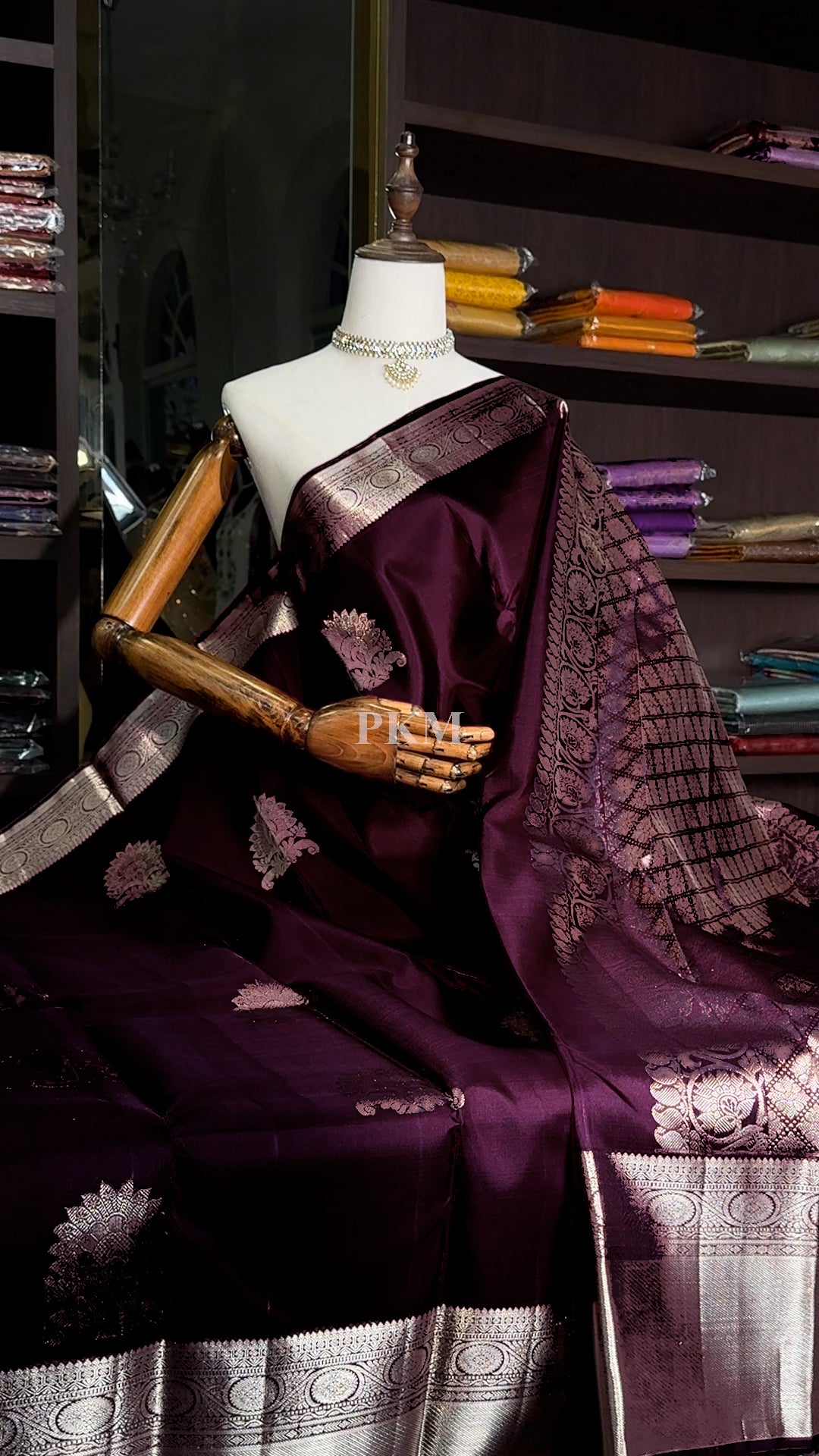 A rich Poison Purple shade, this Pure Handloom Kanchipuram Silk Saree features elegant Silver Flower Motif Jari woven all over the body, exuding classic charm.