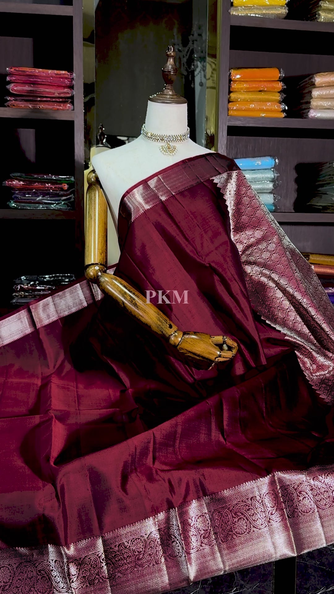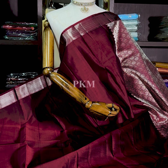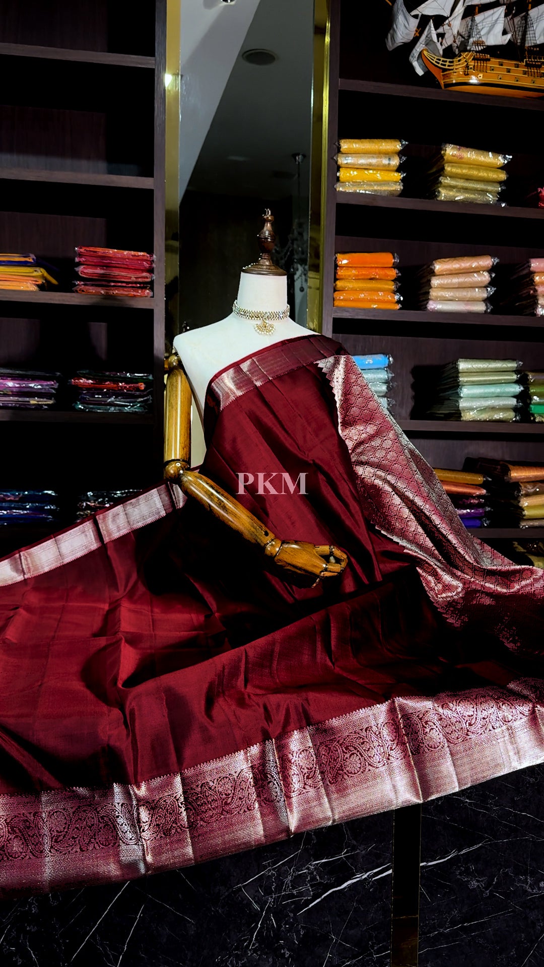 A rich Crimson Apple Red shade, this Pure Handloom Kanchipuram Silk Saree features elegant Silver Flower Jari on the border, exuding classic charm.
