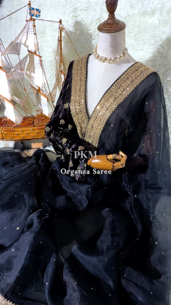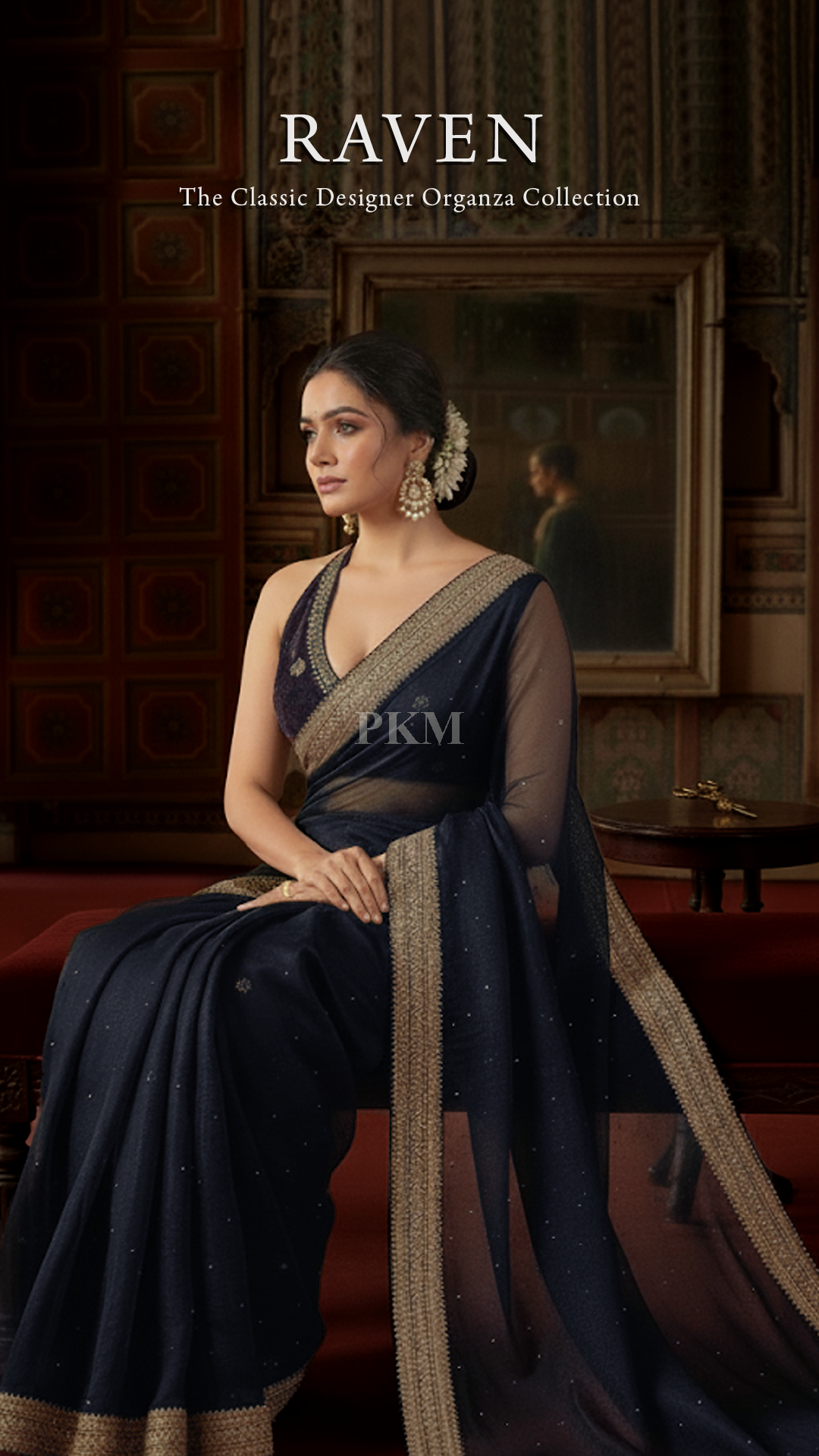 Grace meets elegance in our Raven black organza saree. Featuring Gold flower embroidery along the borders and motifs, this saree drapes light and airy for all day comfort.
