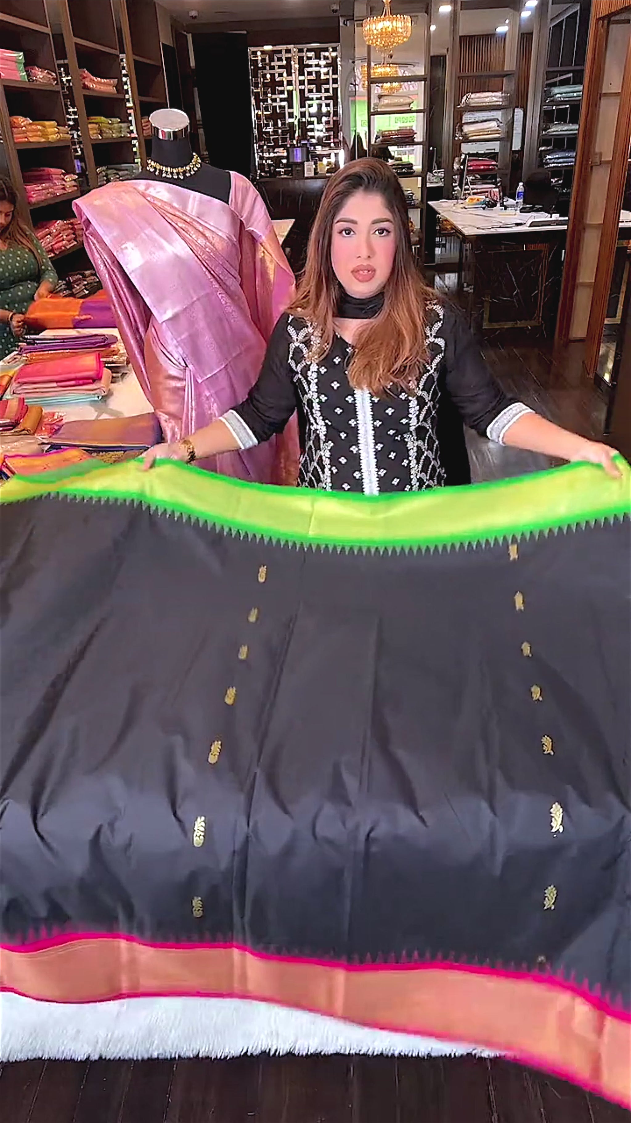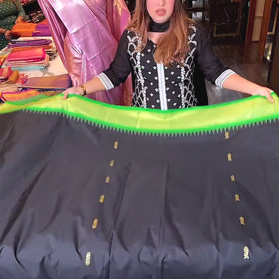 Gold Paisley motifs Weaved over a Raven Black Semi Silk with a Kili Green and Hot Pink Ganga Jamuna Gold Tissue Temple Border