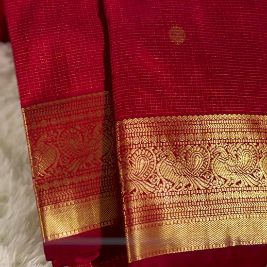 An elegant Sweet Red shade, this Pure Handloom Kanchipuram Silk Saree features delicate Gold Vaira Oosi Checks & Gold Peacock motifs woven all over the body.