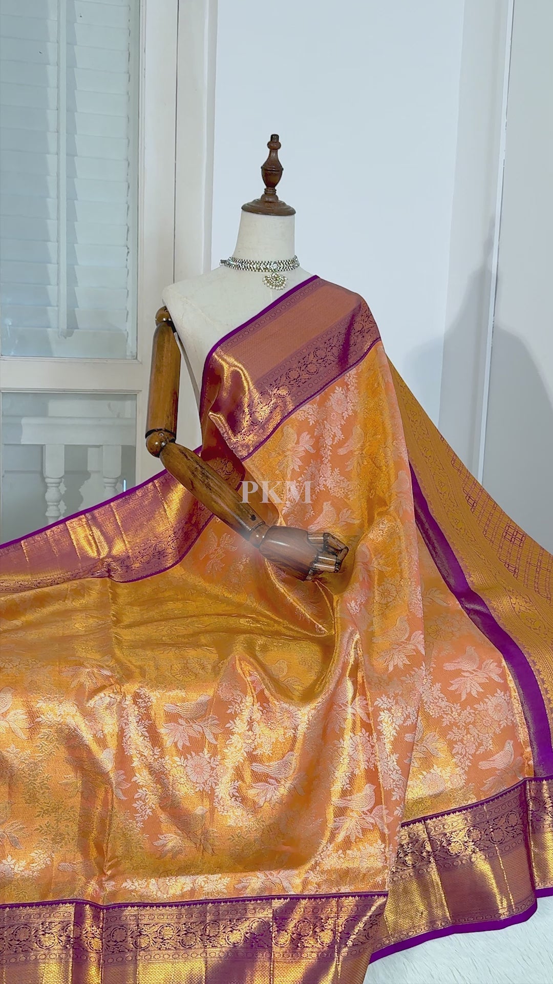 An elegant Sunset Gold Shade, this Pure Handloom Kanchipuram Silk Saree features Bird & Flower Brocade Motifs woven all over the body.
