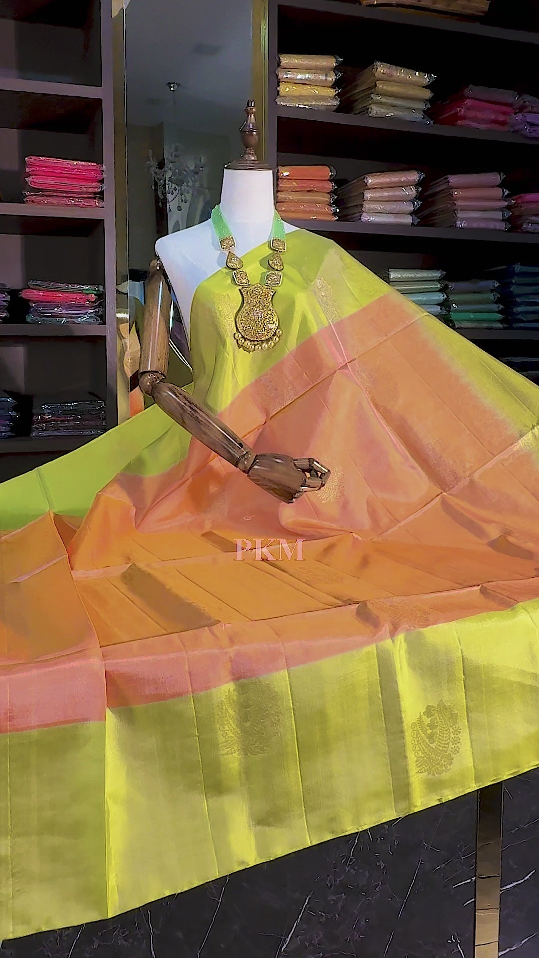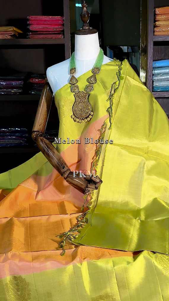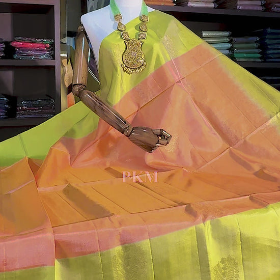 Rock Melon Pastel Orange Shade Pure Handloom Soft Silk with Gold & Silver Jari Flower Motifs woven all over the Body, finished with Melon Green with Flower Motif Borders and a contrasting Melon Green Gold Pallu for a striking look.