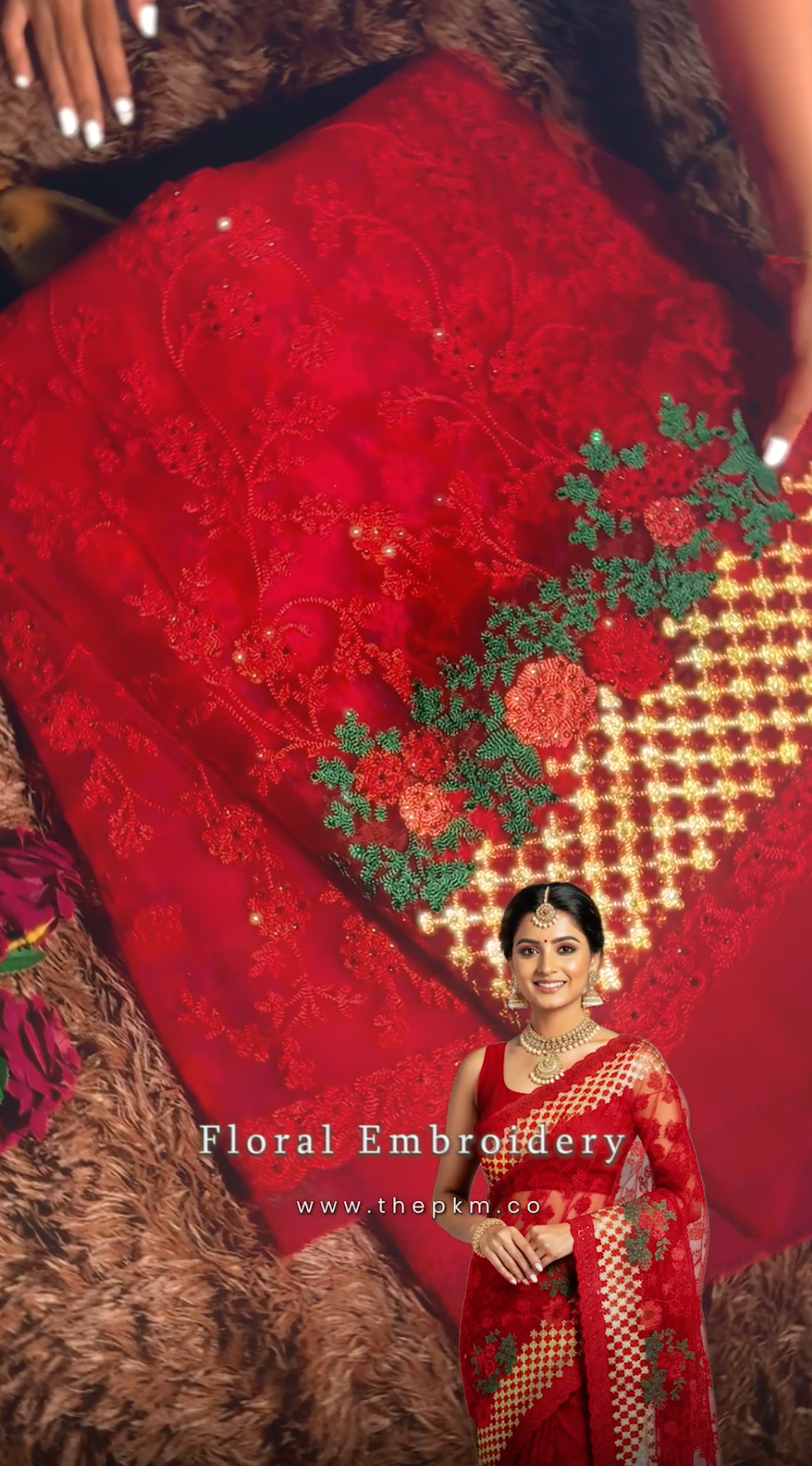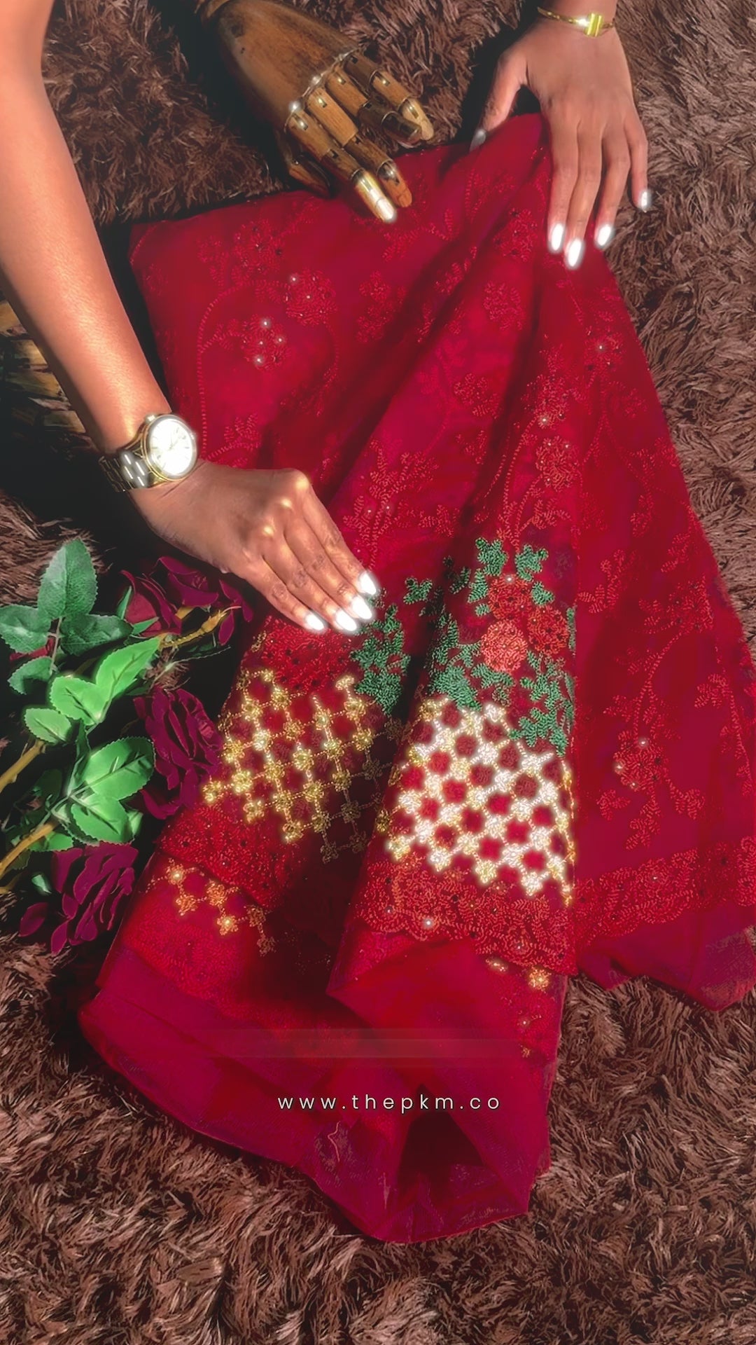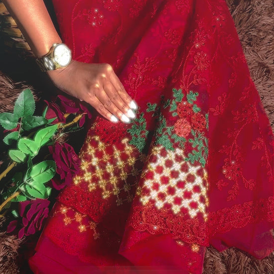 Running Ruby Red Net blouse material attached with Floral Embroidery Borders for the sleeves.