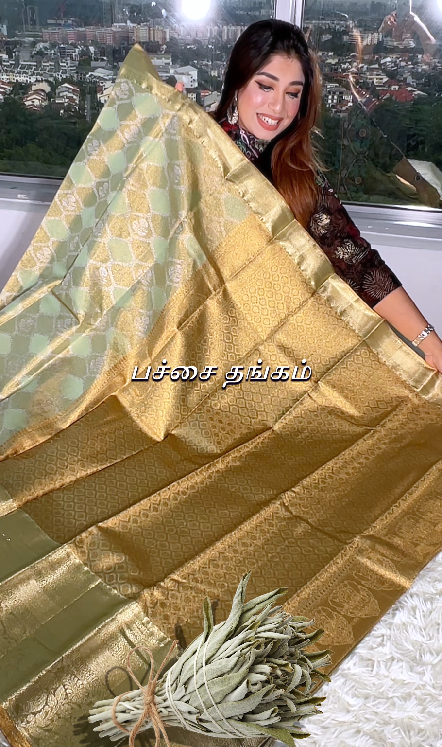 Sage Green Gold semi-silk saree, beautifully adorned with Gold & Silver Brocade Motif woven across the body. The look is completed with a running Sage Green Gold pallu and a Gold Mayil Borders