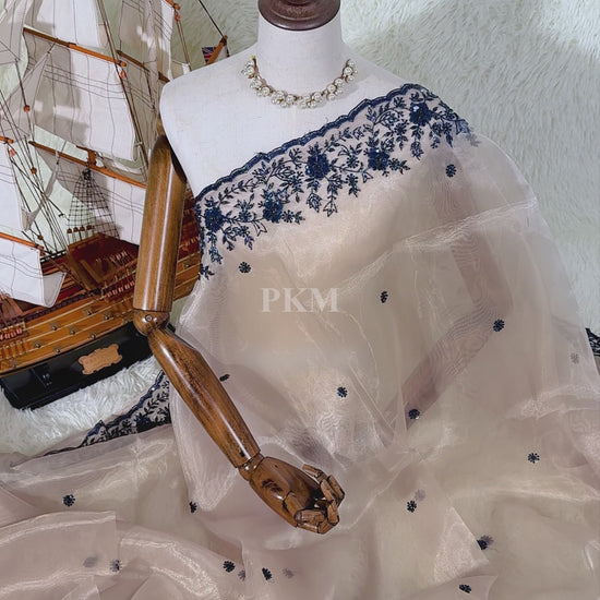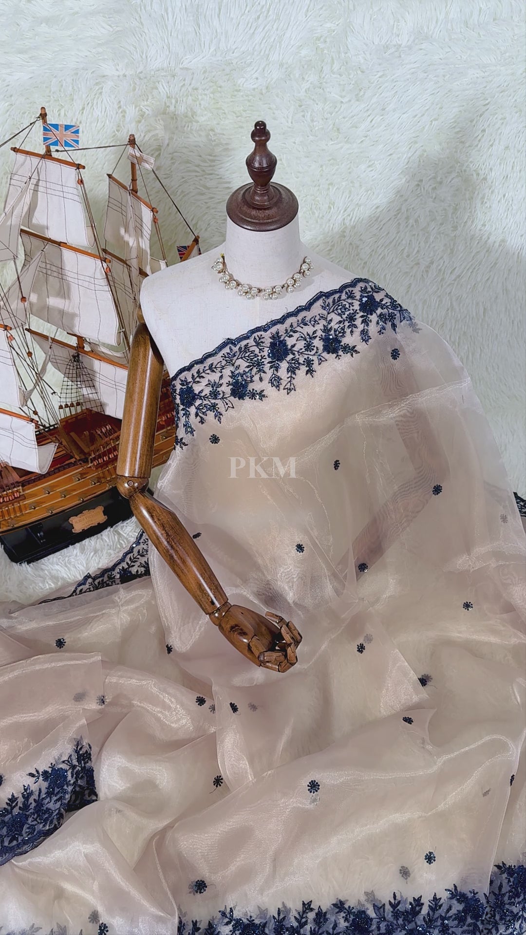 Grace meets elegance in our Sapphire organza saree. Featuring a soft champagne nude body with deep sapphire blue flower hand embroidery along the borders and motifs, this saree drapes light and airy for all day comfort.