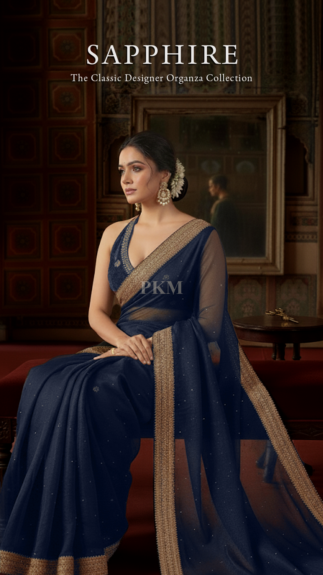 Grace meets elegance in our Sapphire Blue organza saree. Featuring Gold flower embroidery along the borders and motifs, this saree drapes light and airy for all day comfort.