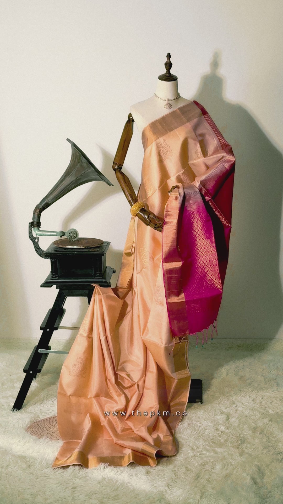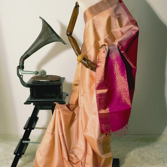 A stunning statement piece, this saree is crafted from Sippi Shell Beige pure handloom soft silk. The body is adorned with intricate, Gold Modern Mayil motifs that are meticulously spaced for a touch of refined elegance. A vibrant Raspberry Pink, framed by sophisticated Gold Tissue borders.