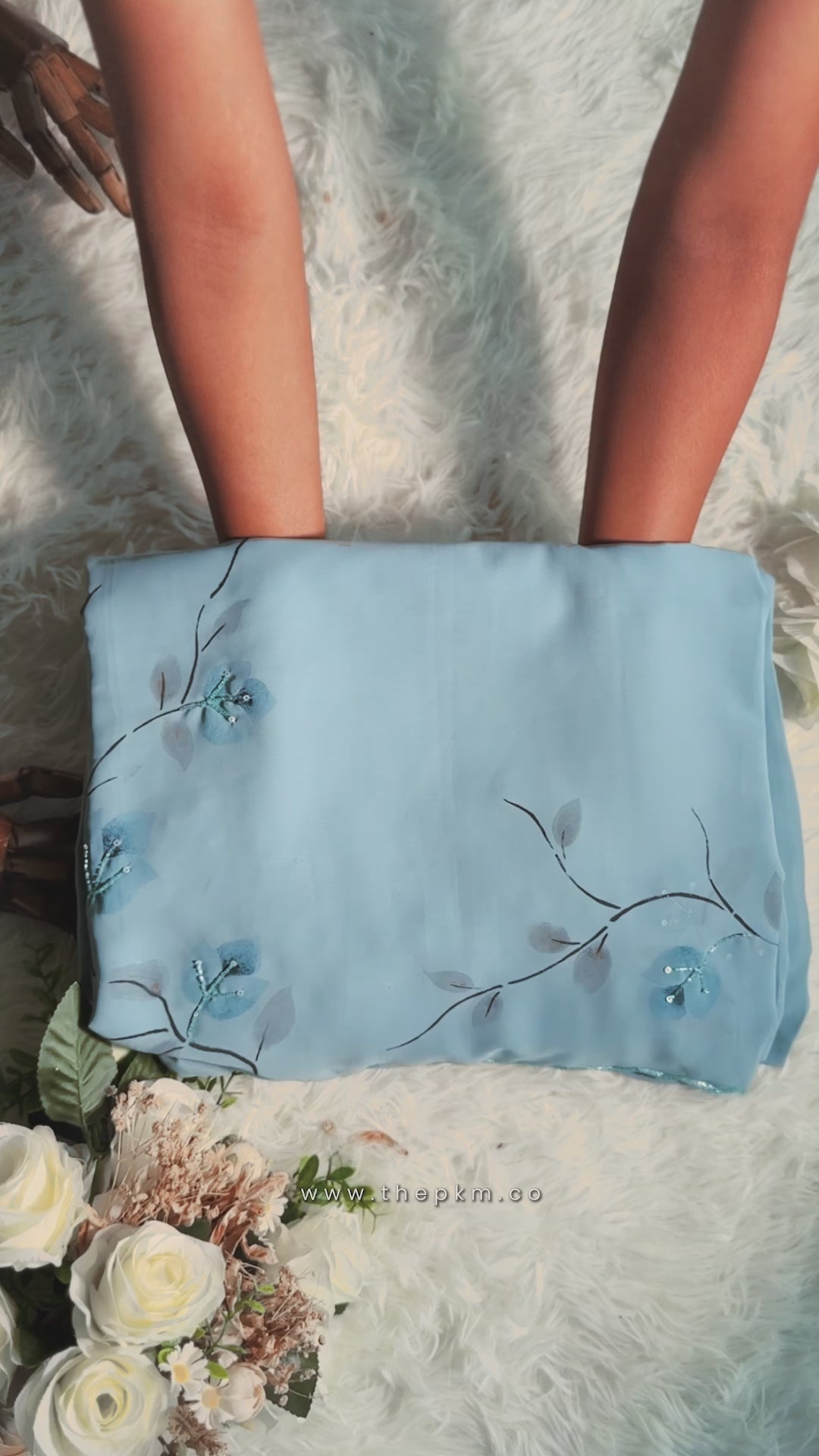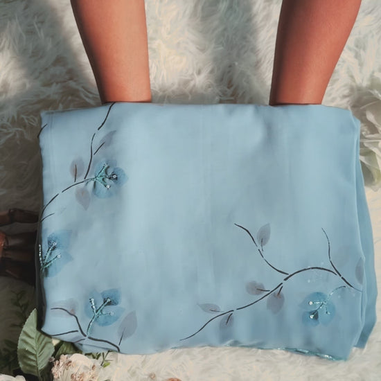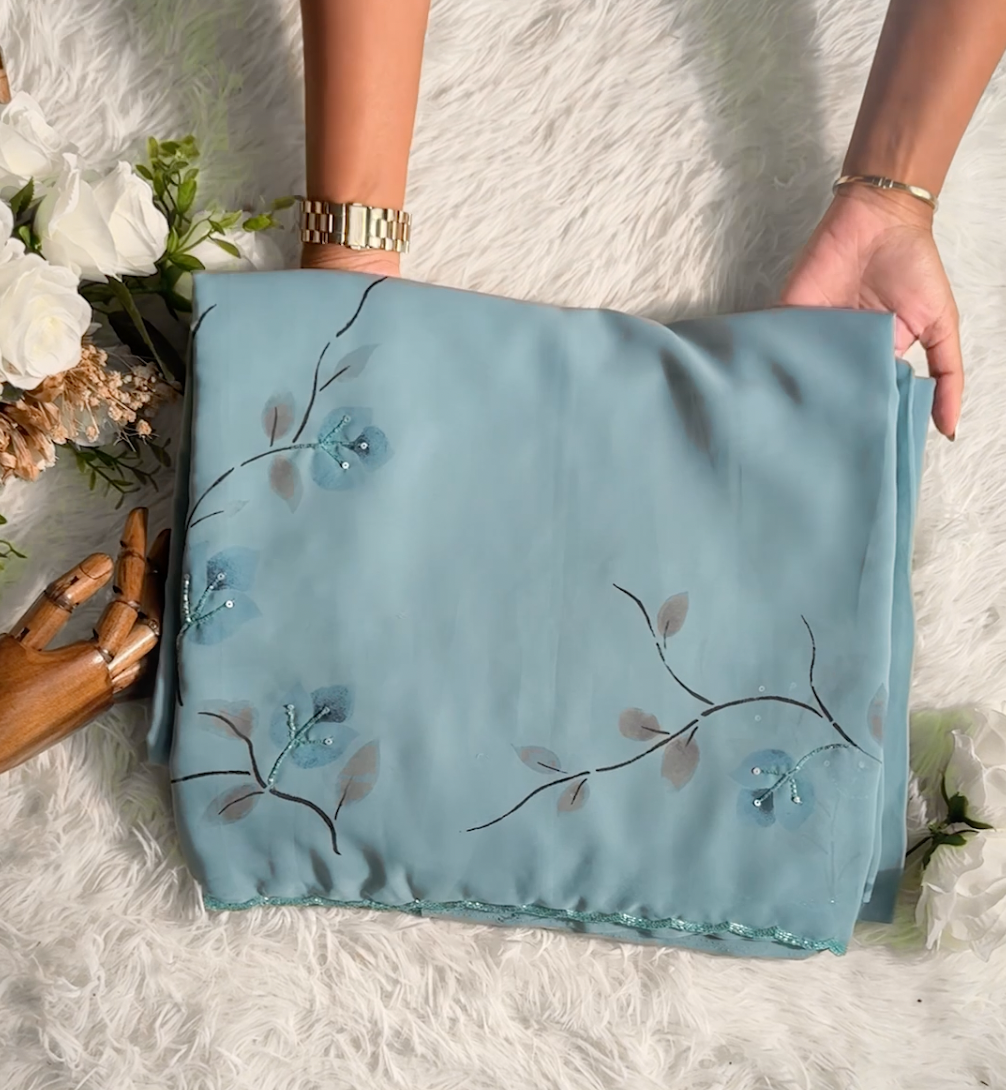 Brush Paintings Floral Motifs Prints with Sequin & Beading works on a Sky Blue Georgette sari with 1 cm Scallop borders.