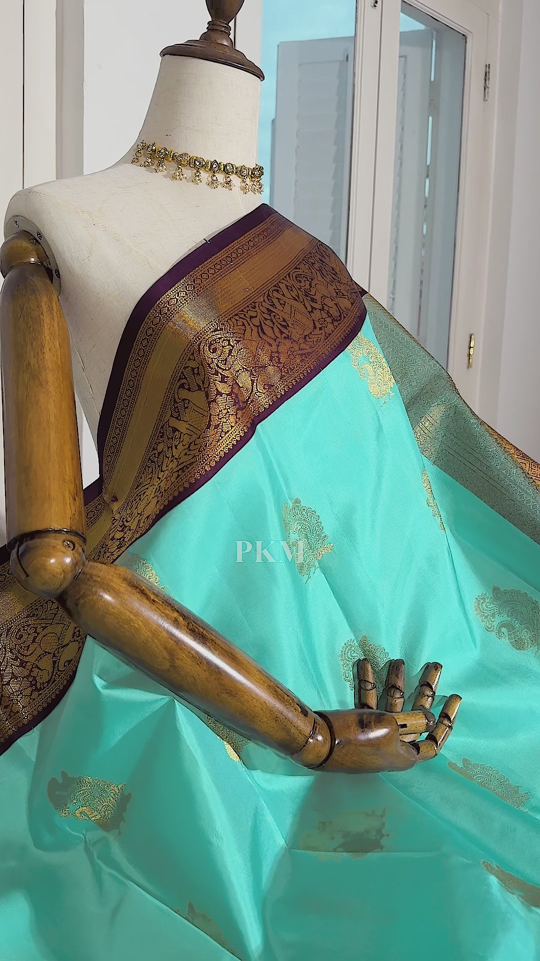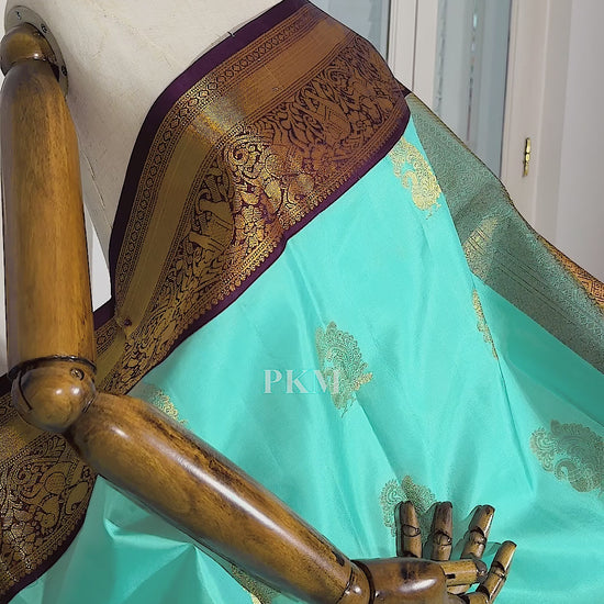 Icy Snow Blue Pure Handloom Korvai Soft Silk with Gold Mayil Jari Motifs weaved all over the Snow Blue body and Gold Yaanai & Kuthirai Motifs along the Gold Crimson Purple borders. Gold Flower weaved all over the Contrast Crimson Purple Gold Pallu .