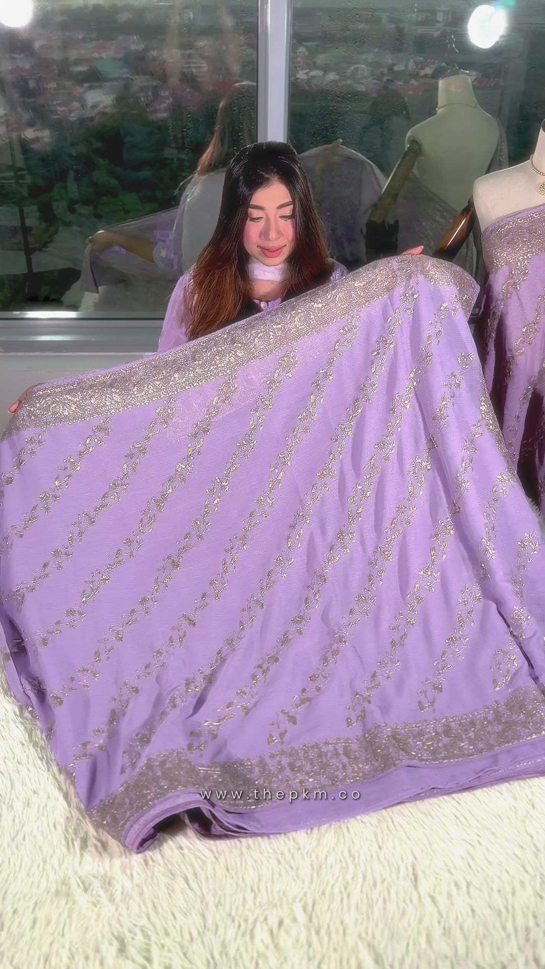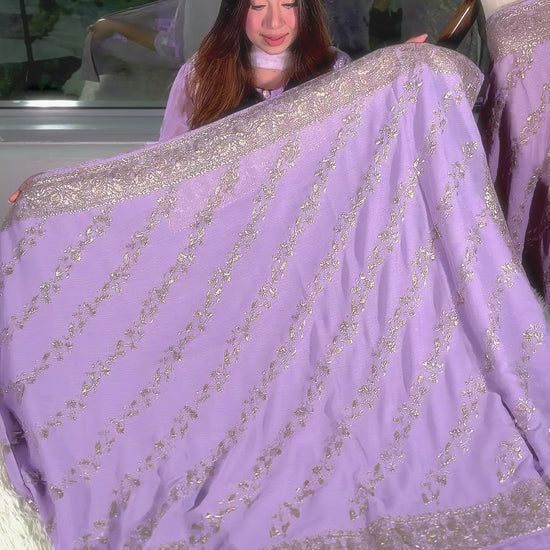 Shimmer Lavender Soft & Lightweight Pure Chiffon Crepe with Champagne Gold Floral Pittai Work. Champagne Gold Flower Diagonally weaved all over the body and across the border. Running Pallu in Lavender with Champagne Gold.