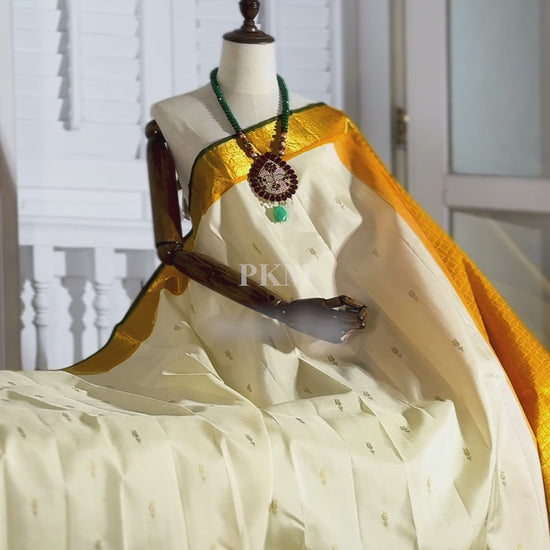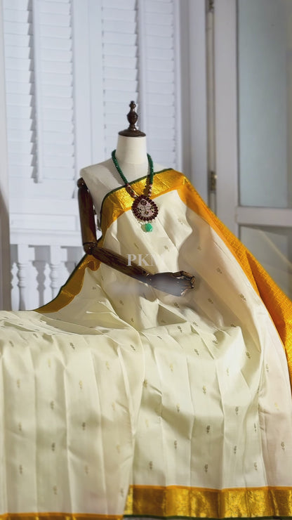 An elegant Ivory White shade, this Pure Handloom Korvai Kanchipuram Silk Saree features delicate tiny gold Peacock motifs woven all over the body.