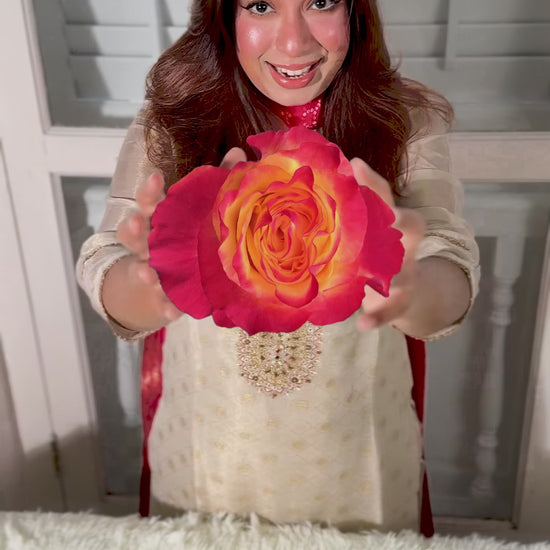 A stunning statement piece, this saree is crafted from Pure Handloom Soft Silk in a Sunset Orange. The body is adorned with intricate, Silver Flower motifs. Vibrant Rosy Mauve Borders and Pallu with Silver Jari.