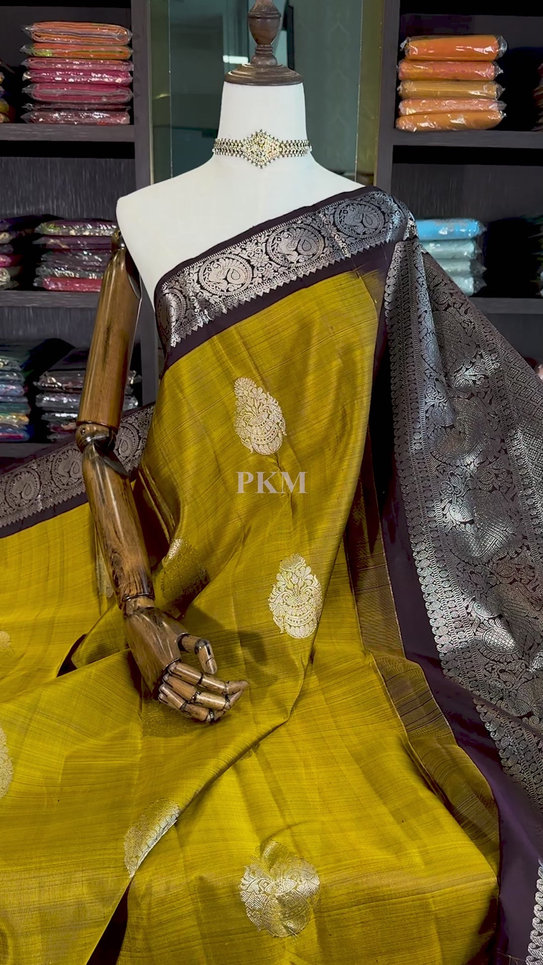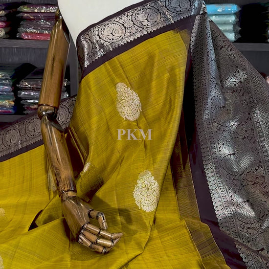 An elegant Vendhayam Fenugreek shade, this Pure Handloom Kanchipuram Silk Saree features delicate Silver Flower Motifs woven all over the body. Karuncheeragam Brown borders with Silver Jari Mayil Motifs.