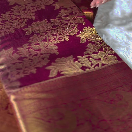 A striking Kismis Thiratchai Purple Shade, this Pure Handloom Brocade Kanchipuram Silk Saree is adorned with delicate Antique Gold Floral Hibiscus motifs woven all over the body, exuding subtle elegance.