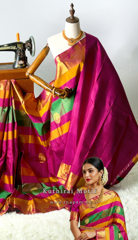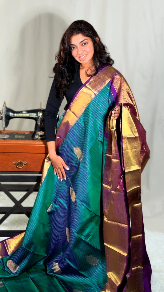 Discover the timeless elegance of our latest Handloom Kanchipuram Collection, meticulously woven in a curated palette of rich jewel hues and soft pastels. Each saree is a testament to the craftsmanship of traditional South Indian weaving.