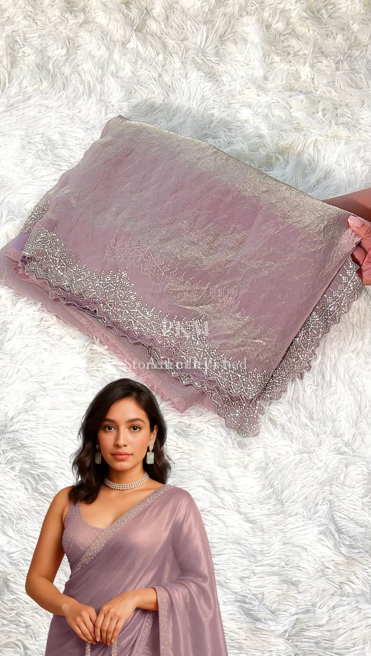 Stone Embellished Tiara on an Amethyst Purple Shimmer Crepe Organza sari with 3-inch Tiara Scallop Borders.