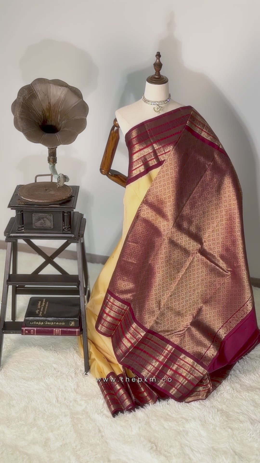The Border: Traditional Korvai Borders featuring a striking blend of Maroon and Deep Red stripes, interwoven with subtle Gold floral patterns.