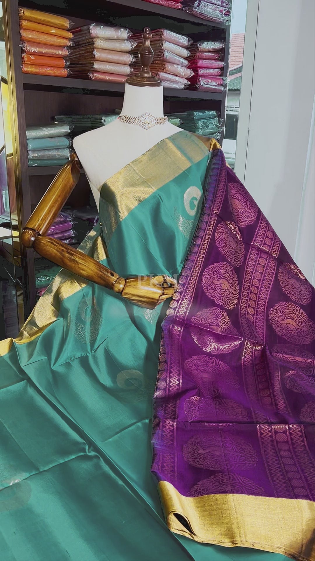 The Pallu: A vibrant Mulberry Purple Pallu featuring Gold Peacock Motifs, offering a graceful and majestic pop of colour.