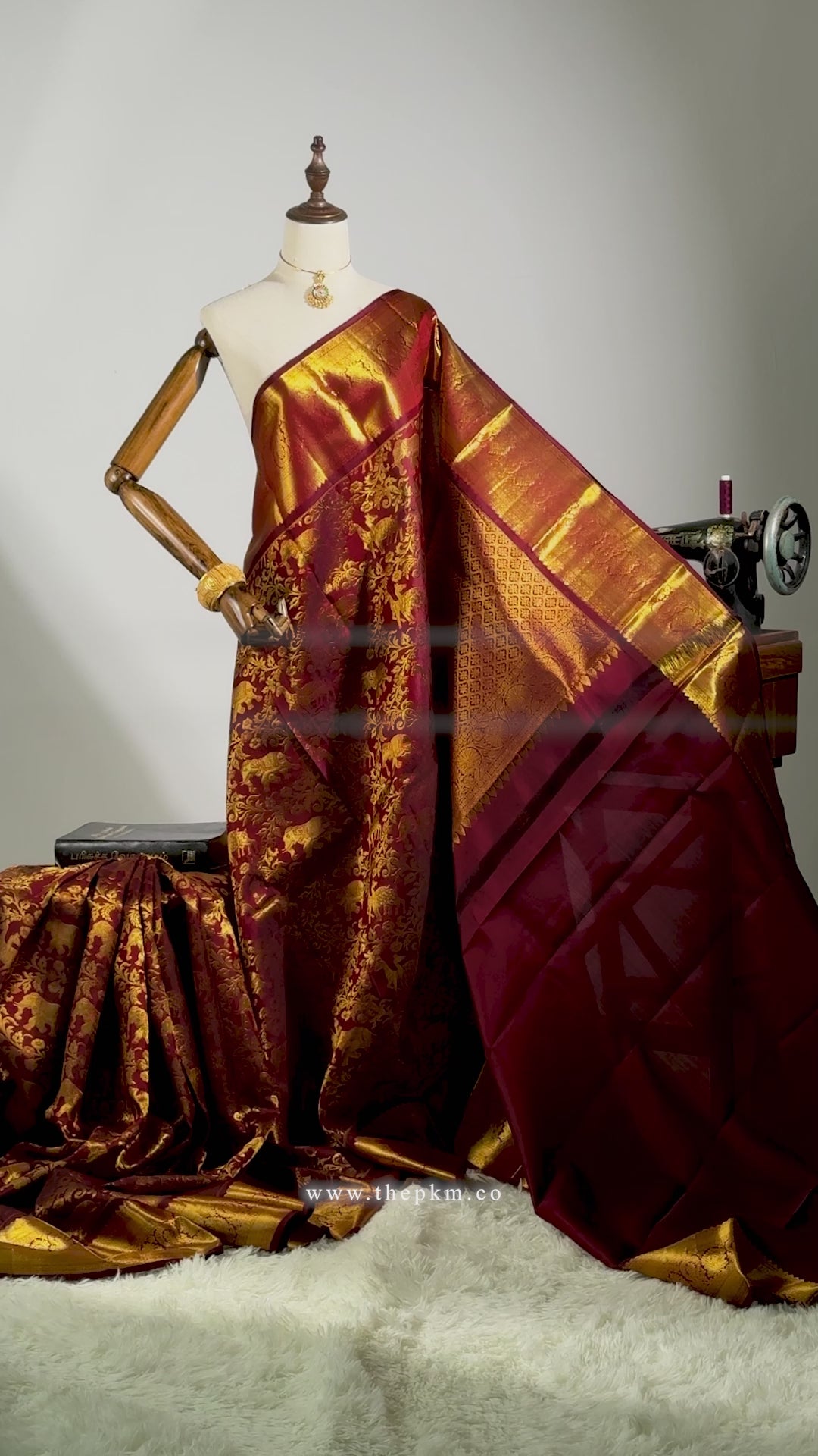 The saree features a matching Brick Red Gold pallu, beautifully accented with intricate Flower Motif weaved across the Gold Borders