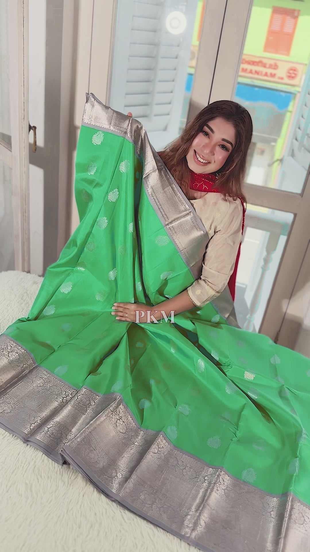 The Blouse: A perfectly matched Ash Clay Grey blouse material, designed to provide a balanced and elegant complement to the Ceramic Green body.