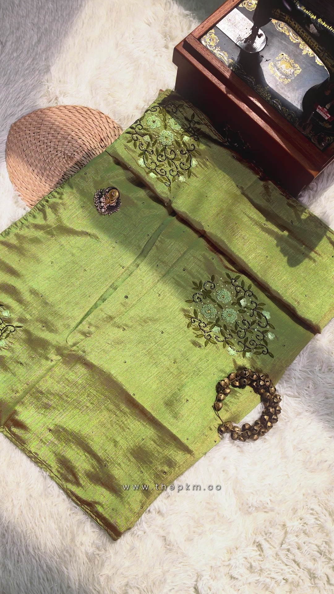 A breathtaking Clover Mishru Silk Saree, featuring a mesmerizing double-shade of Green and Orange. This ensemble is meticulously adorned with sequin and thread floral embroidery, interspersed with delicate small pearls across the entire body for a shimmering, multidimensional glow.