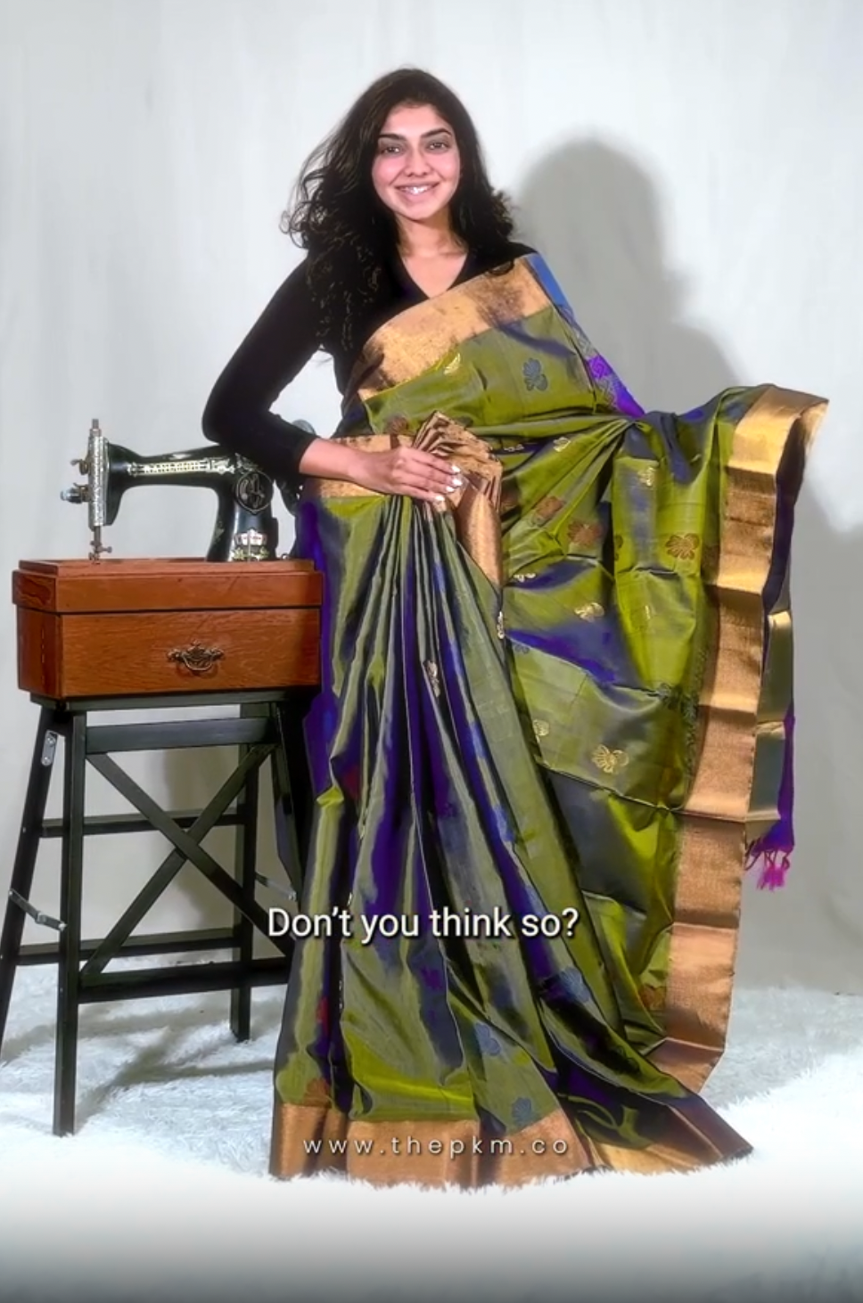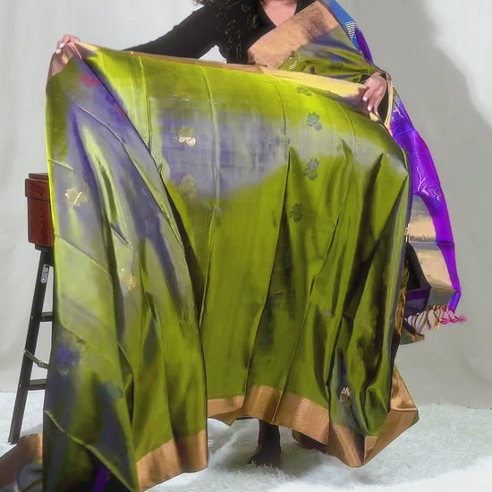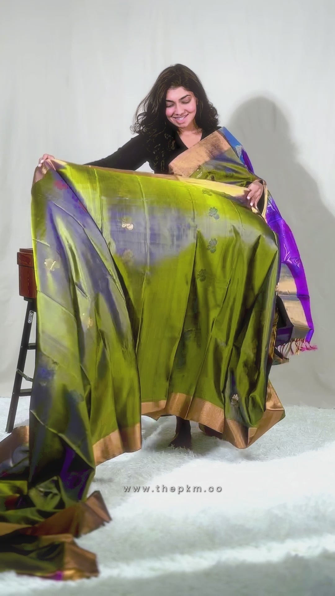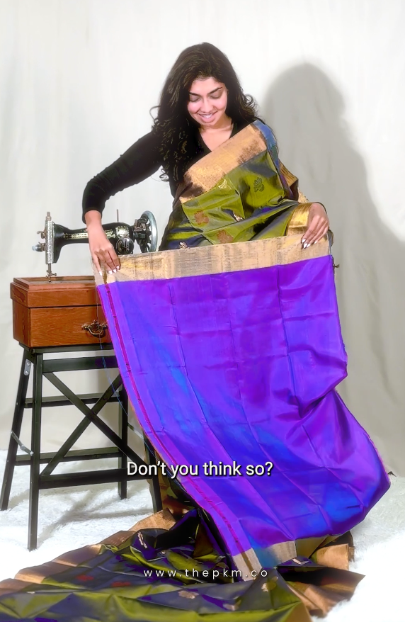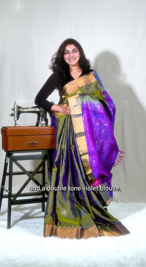 The Palette: A cosmic Green-Blue Double Tone body contrasted against a rich, shifting Violet Double Tone pallu and blouse.