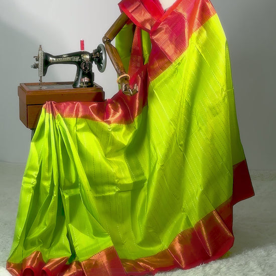 A captivating Kili Parrot Green, this Pure Handloom Kanchipuram Silk Saree features delicate silver & gold jari stripes woven all over the body, exuding refined elegance.
