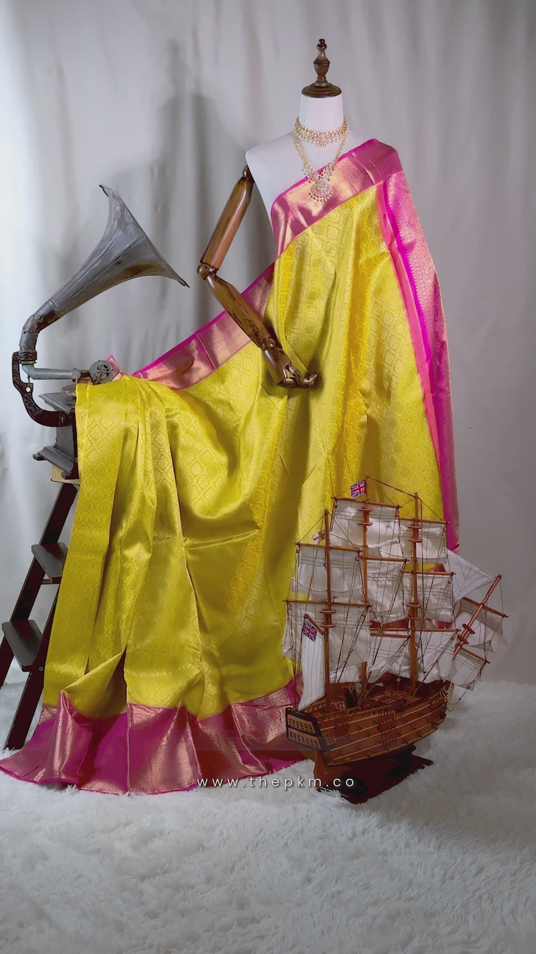 The Palette: A cheerful Lemon Yellow base contrasted with a Fuchsia Pink pallu, creating a vibrant and harmonious look.