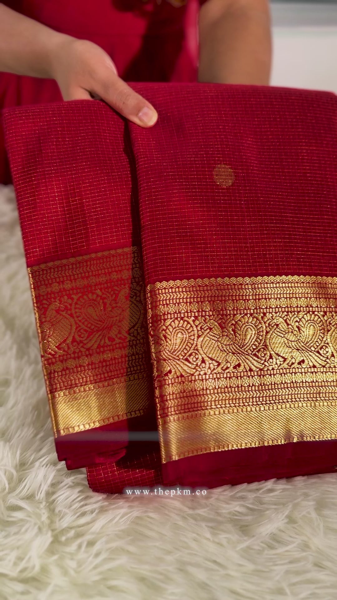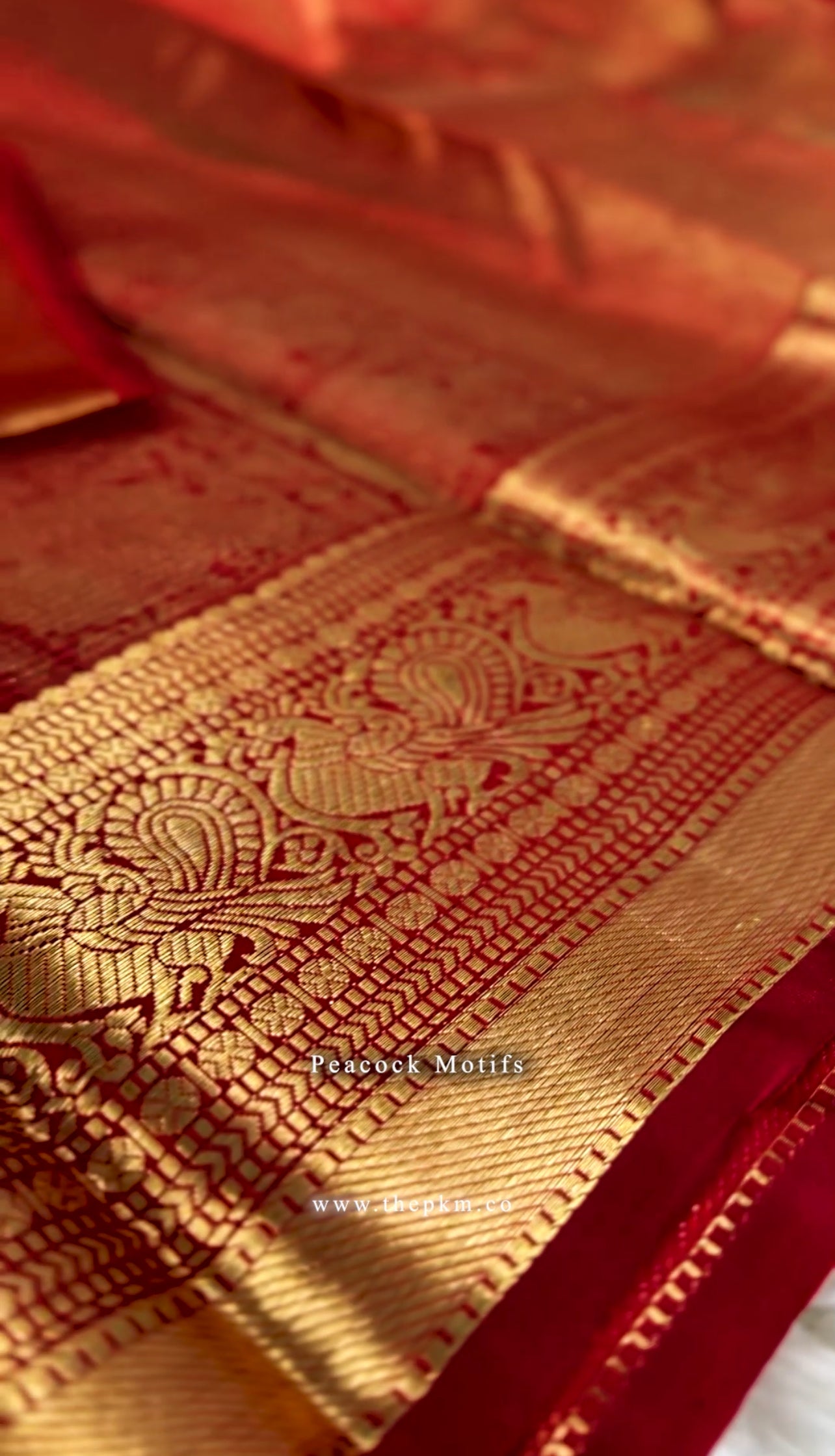 The saree is beautifully paired by a Sweet Red Pallu and framed with classic Gold Peacock Jari borders for a vibrant finish.