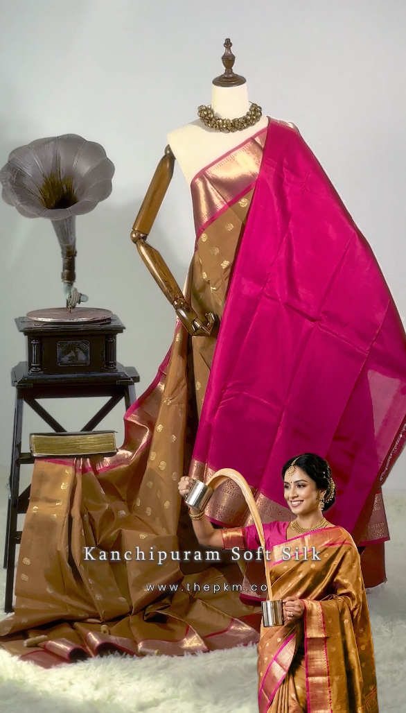 A warm, aromatic masterpiece of color and tradition, this saree is crafted from Pure Handloom Kanchipuram Soft Silk in a rich Teh Brown. The fabric mimics the perfect, frothy blend of pulled milk tea, serving as a cozy yet sophisticated backdrop for its golden embellishments.